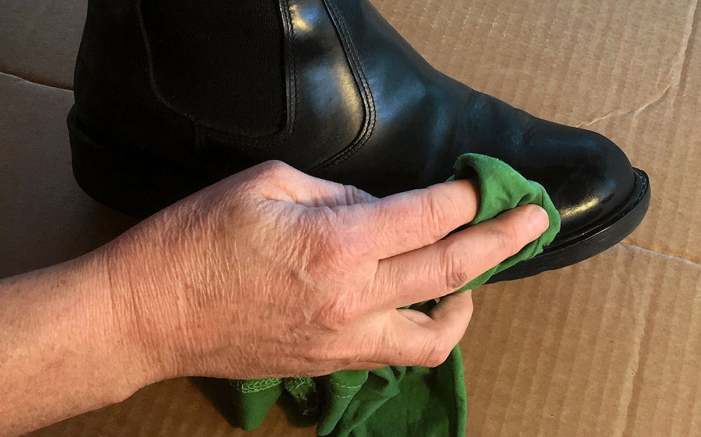 7. Avsluta med skokräm. Vi väljer en svart skokräm med bivax. Det svarta fräschas upp, lädret blir mjukt och bivaxet fyller ut små sprickor. Sista glansputs görs med en gammal nylonstrumpa, det finns inget bättre.