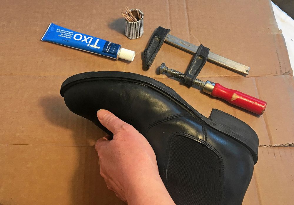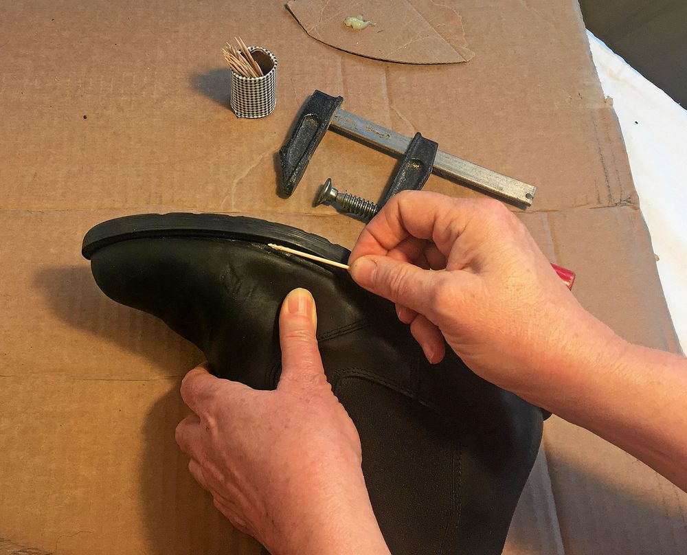 3. Sätt lite lim i glipan mellan överdel och sula med hjälp av tandpetaren. Håll isär en stund så att limmet får torka till lite.
