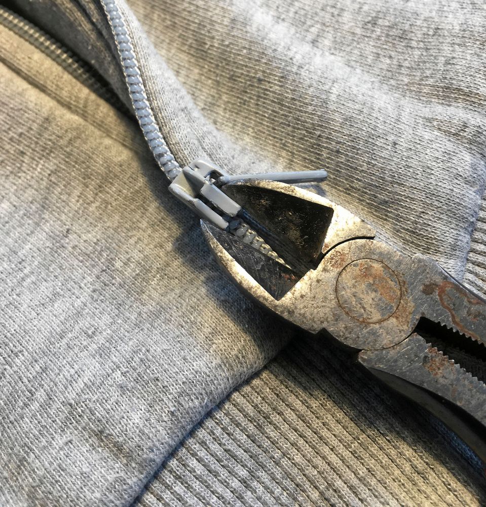 3. Ta en tång och knip ihop gapet lite. Testa sedan om blixtlåset fungerar. Hjälper det inte måste löparen bytas. Vi använder en liknande löpare från ett kasserat plagg men det finns också löpare att köpa som bara knäpps på plats.