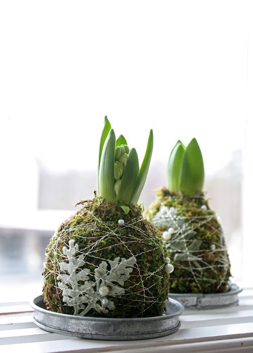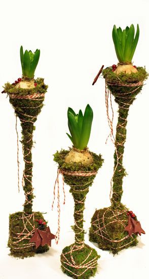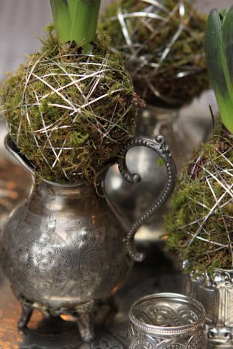 Runt hyacintlöken binds mossa fast med silvertråd försedd med små pärlor. Några blad silverek förgyller. Vattna genom att försiktigt fukta mossan med vattenspruta.