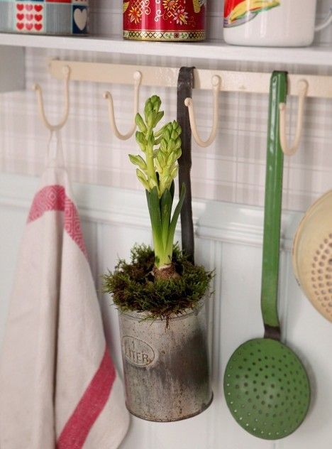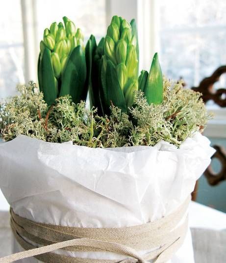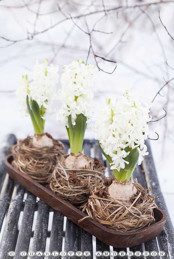 Hyacinten kommer extra mycket till sin rätt om den kommer upp lite. Ett smart sätt är att linda in lökarna i mossa och låta dem stå i husets finaste silversaker.
