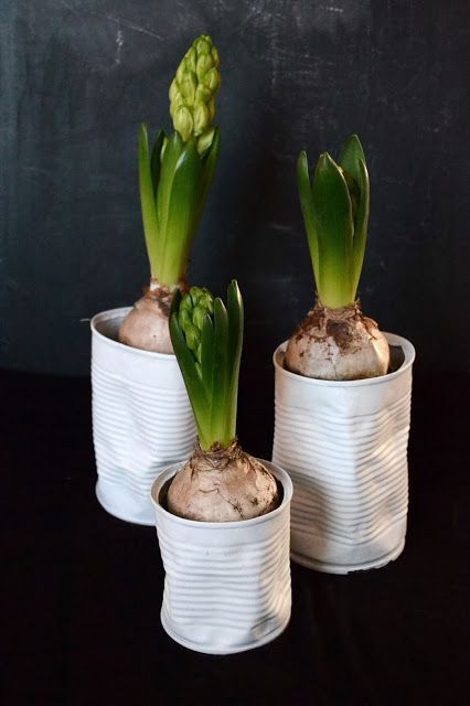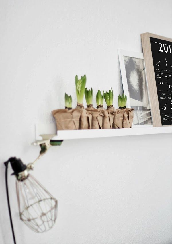 Inte är de snygga, de svarta och kantiga krukorna som lökarna kommer i från affären. Göm dem i papper. Sätt en bit plast runt krukan först bara så att det går att vattna utan att papperet blir blött.