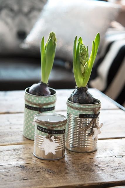 Blanka konservburkar helt eller delvis täckta med tapetbitar blir fina krukor.