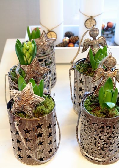Lyktor eller krukor? Spelar ingen roll. Eftersom löken kan lindas in i mossa så kan man till och med plantera den i lyktor med massor av stjärnformade hål utan att det blir smul på bordet.