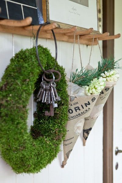 Lek med hyacinterna, gärna på höjden. Det här är enklare än det ser ut. Lökarna har stuckits fast på metalltrådar som förankrats i betongfyrkanter, ibland används de som hållare för placeringskort. Sedan har hela kalaset täckt med mossa.
