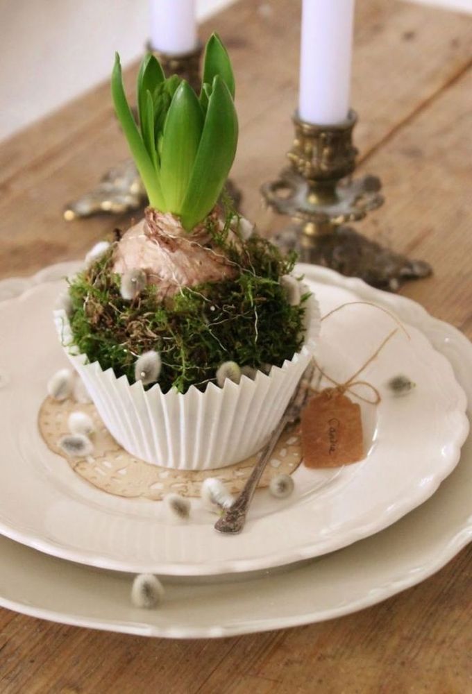 En knoppig hyacint blir både tallriksprydnad och present. Löken i mossbollen har också pyntats med små, små videkissar fästa med knappnålar.