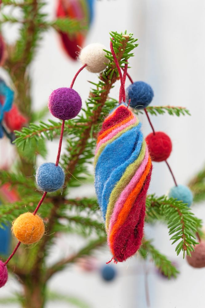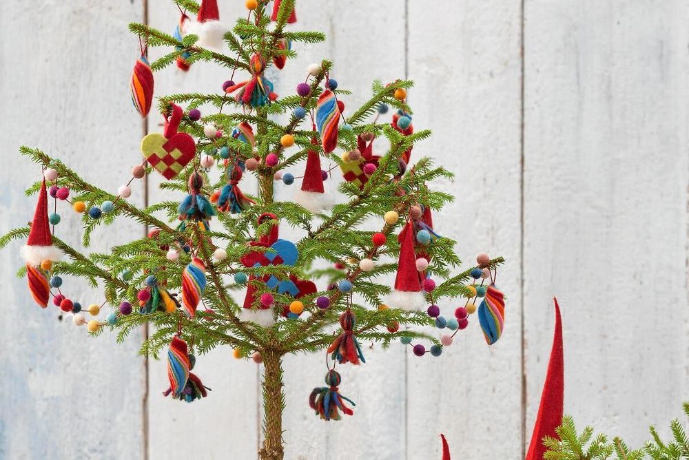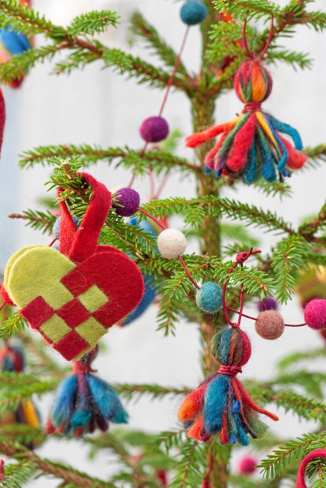 Tomtar och flätade korghjärtan. Ta nya grepp på traditionella gamla godingar och gör dem i mjuka filttyger med lite mer färg. Fyll hela granen med filtmjuka figurer i folkloristiska färgglädje!