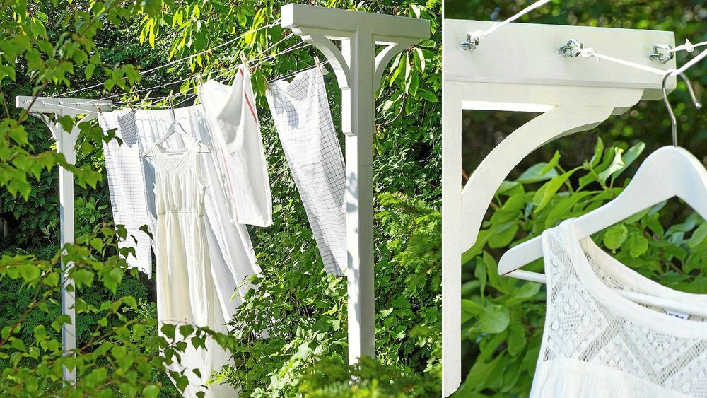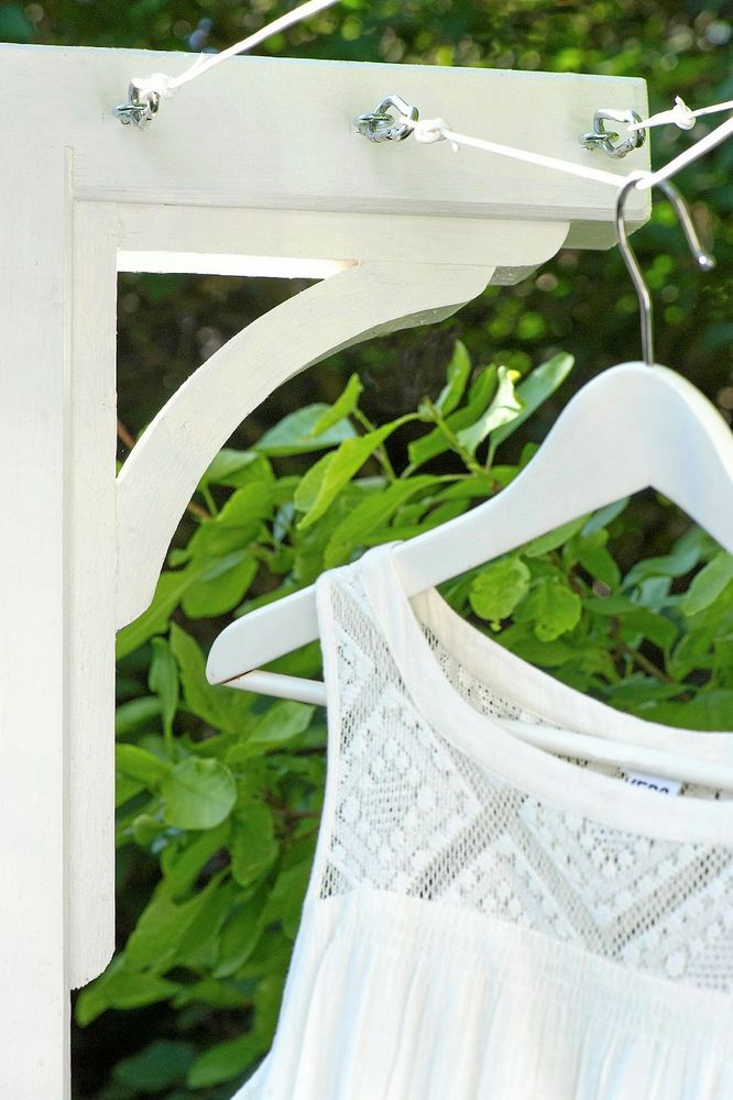 9. Måla torkställningen. Konsolerna av obehandlat virke bör målas innan de monteras på stolparna. De tryckimpregnerade delarna ska inte målas direkt. Vänta därför tills nästa utesäsong med att måla stolpar och överliggare även om det ser lite konstigt ut första sommaren. Risken finns annars att salterna i impregneringen förstör färgen.