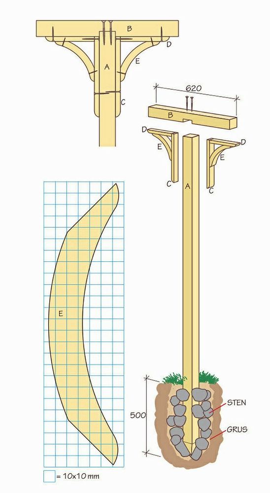 - Tryckimpregnerad stolpe 70x70 mm: 2 st 2300 mm (A), 2 st 620 mm (B).