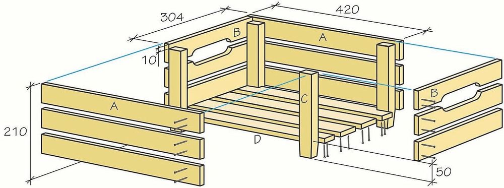 3. Limma och spika fast delarna B på benen C till de två gavlarna. Förborra i B för att undvika att listen spricker.