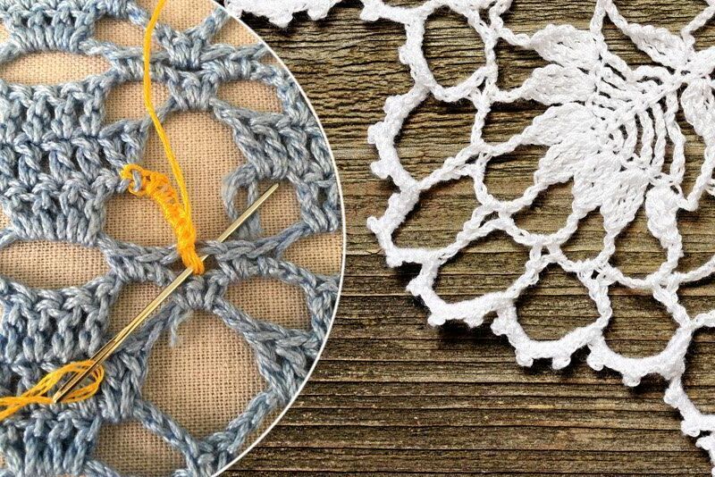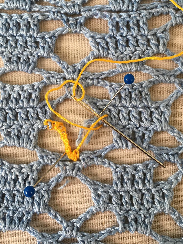 Låna från den konsten när en virkad duk går sönder. Nåltekniken hjälper dig bygga upp nya stolpar och maskor där de gamla gått av.