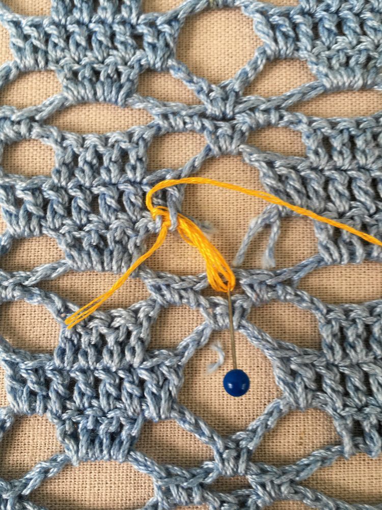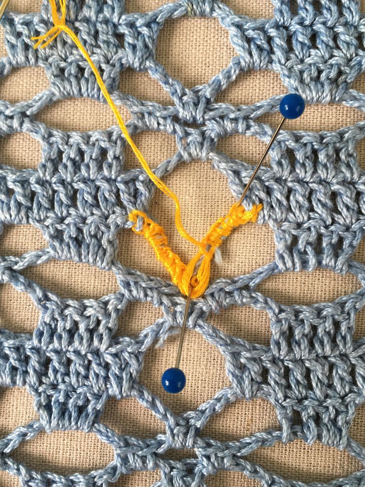 Saknade stolpar och luftmaskbågar byggs först upp med trådar för att de ska bli lika tjocka som originalet. Lägg duken på något mjukt och sätt knappnålar som stöd.