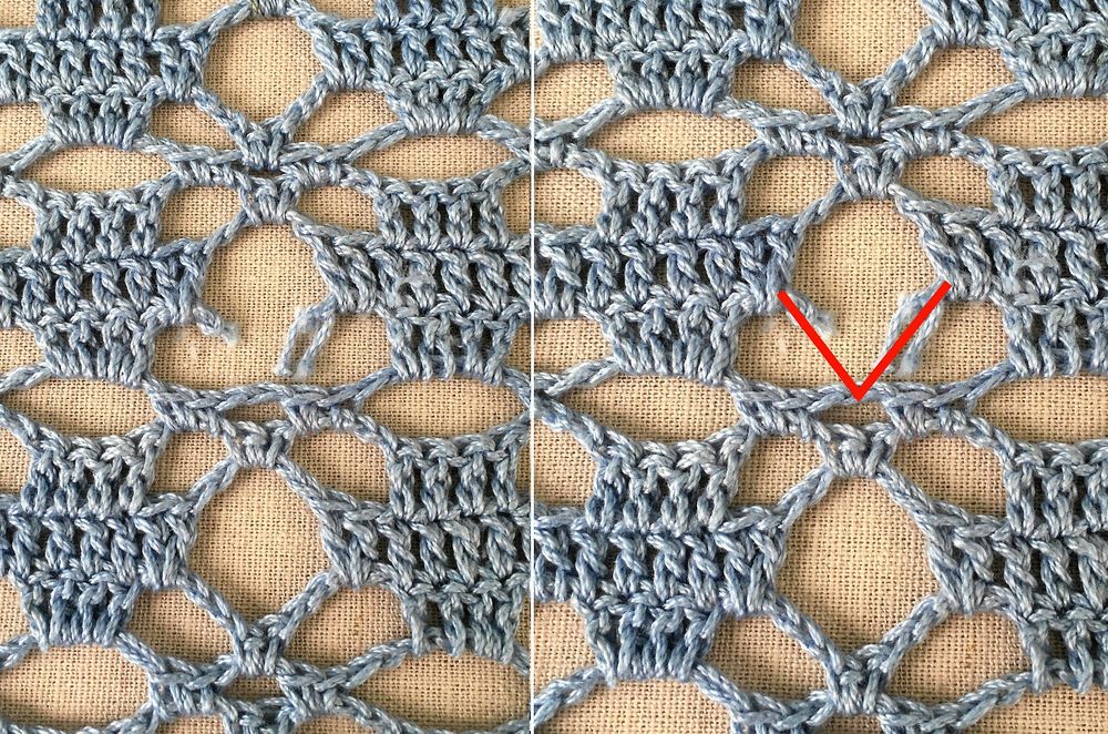 Virkning som skadats kan repa upp sig. Börja med att knyta ordentligt i kanten där skadan börjar så att den inte blir större. Ibland kan det krävas flera knytar i början av din lagningstråd för att hindra att luftmaskor kryper ur och stolpar halkar av.