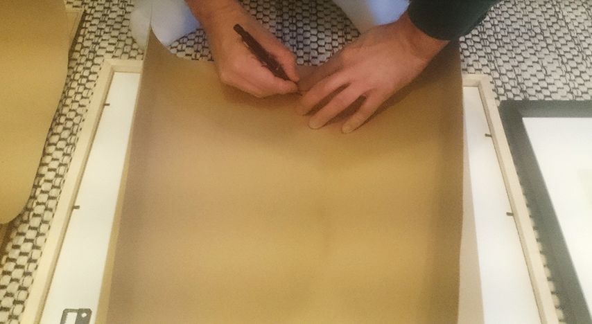 3. Klipp nu ut dina papperskopior. Para ihop rätt form med rätt tavla och märk ut på pappersarket var själva upphängningen (spiken eller skruven) ska sitta genom att lägga pappret på ramens baksida, känna genom pappret och markera med pennan.