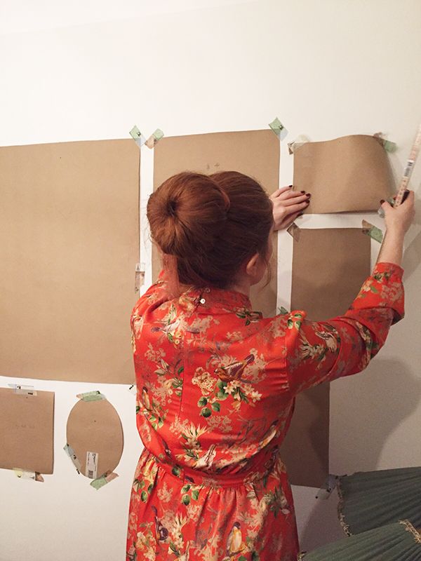 2. När du har kommit fram till hur du vill att de ska sitta, lägg en tavla i taget på täckpapper och rita av formen. Skriv gärna också vilken tavla formen tillhör så slipper du leta i steget längre fram. Lägg sedan tillbaka tavlan på sin plats i formationen. Upprepa med varje tavla.