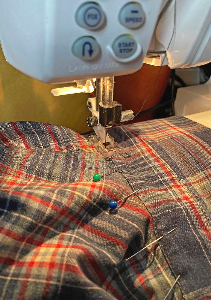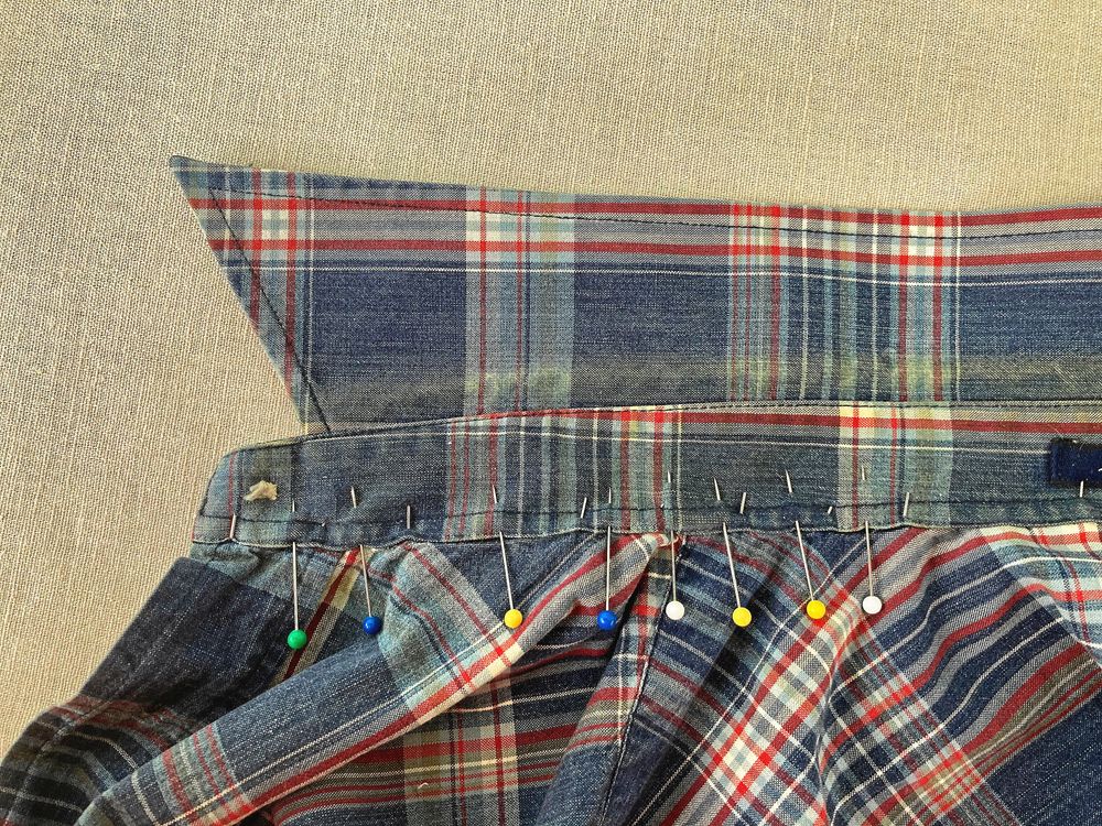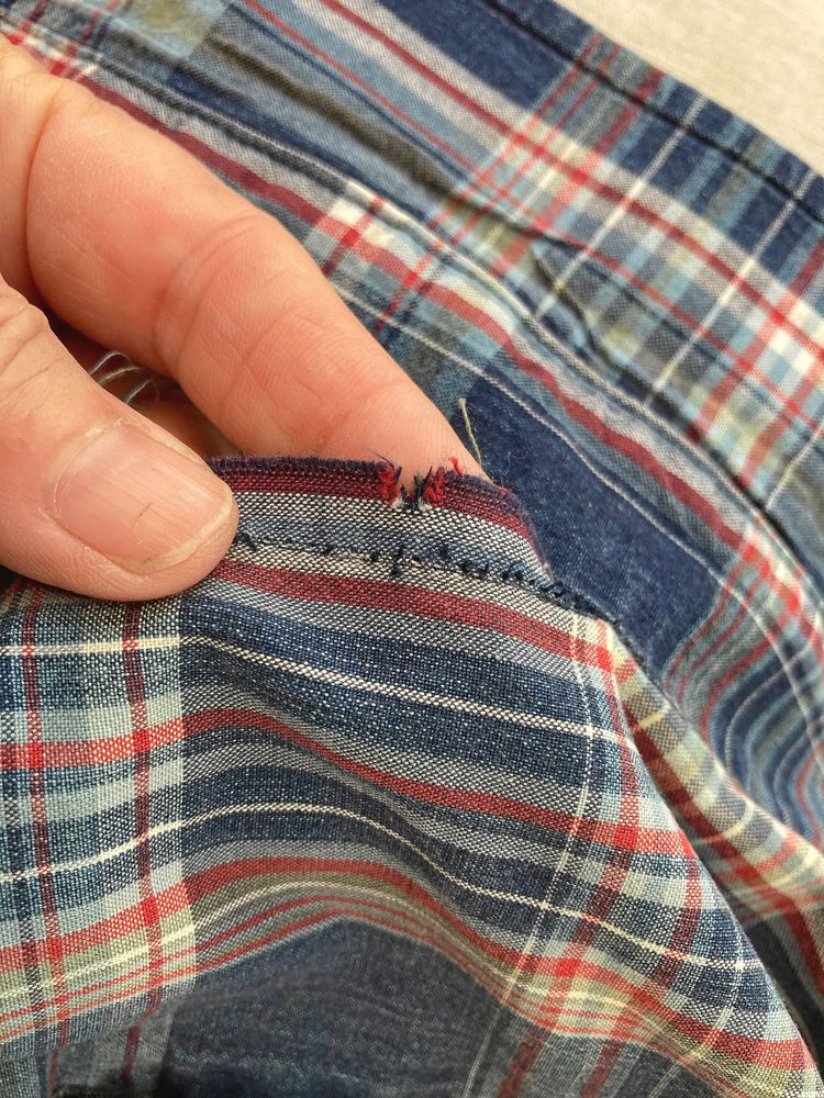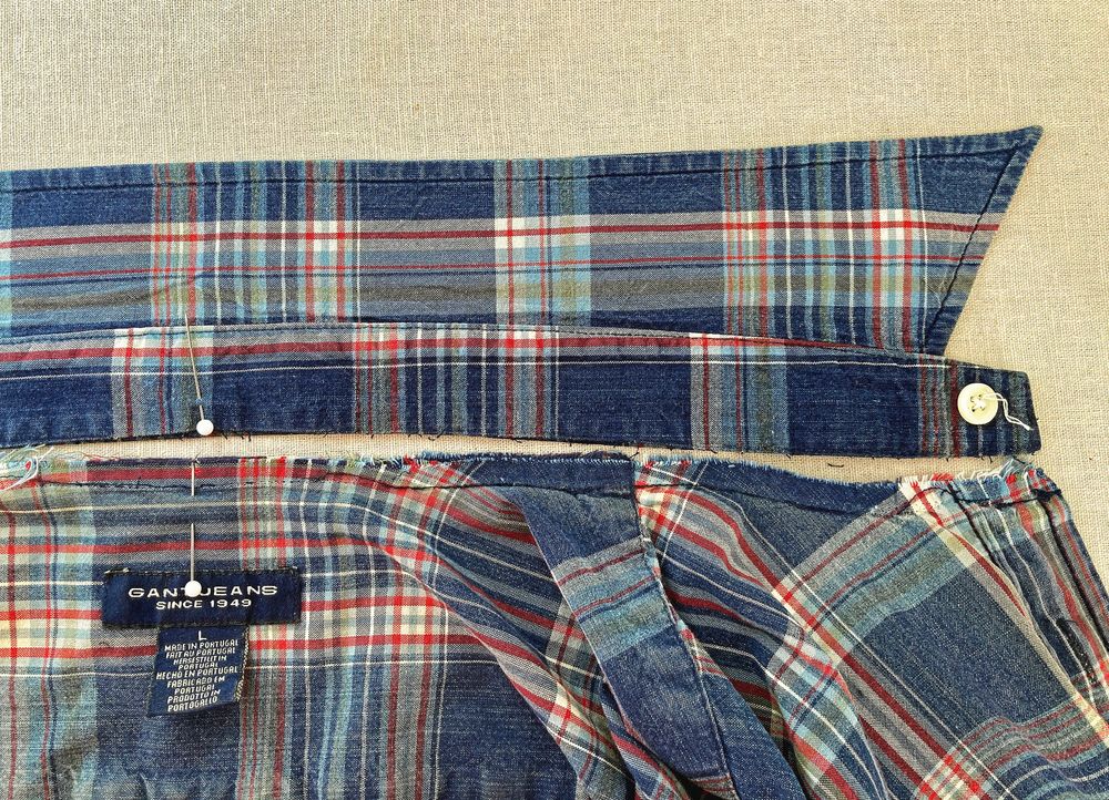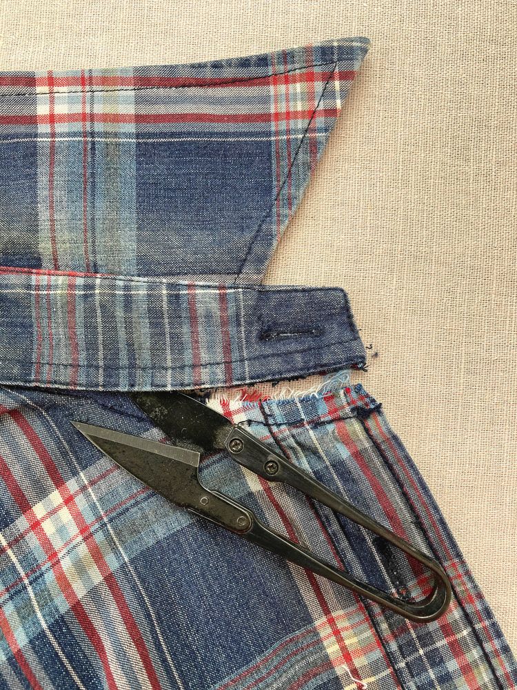 1. Kragståndet är fiffigt byggt, som en dubbelmacka med skjortan instucken i nederkant och själva kragen i överkant. Börja med att sprätta bort kragståndet från skjortan.