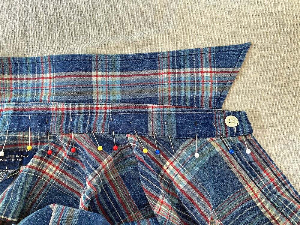 5. Vänd och nåla också på andra sidan. När du syr ska synålen gå rakt genom alla lagren längst ner på kragståndet. Utan nålar på baksidan kan kanten sladda runt så att nålen missar den.