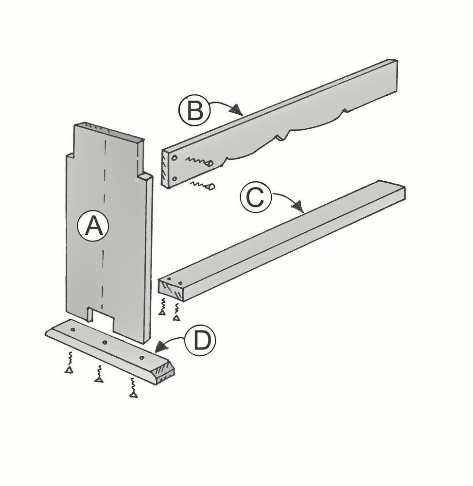 A – Gavel: 2 st, görs ca 20-25 cm bred och 45 cm hög. Virket bör vara minst 28 mm tjockt. Gaveln kan göras av två ihoplagda brädor för att få ihop tillräcklig bredd.