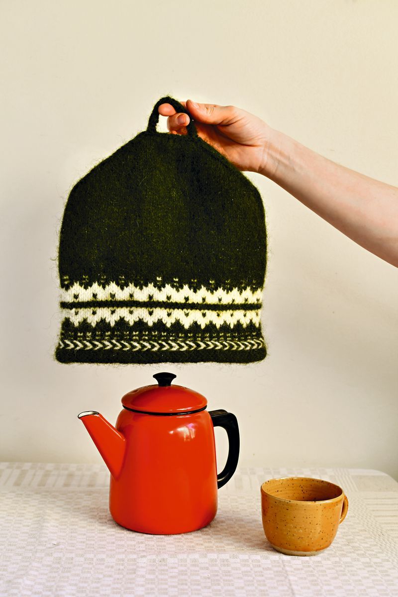 Här är tehuvan i ull som värmer både tekannan och hjärtat lite extra.