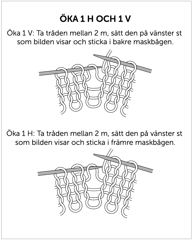 Förkortningar: rm = rät maska, am = avig maska, m = maska, st = sticka, v = varv, 1 H = minskning åt höger, 1 V = minskning åt vänster.