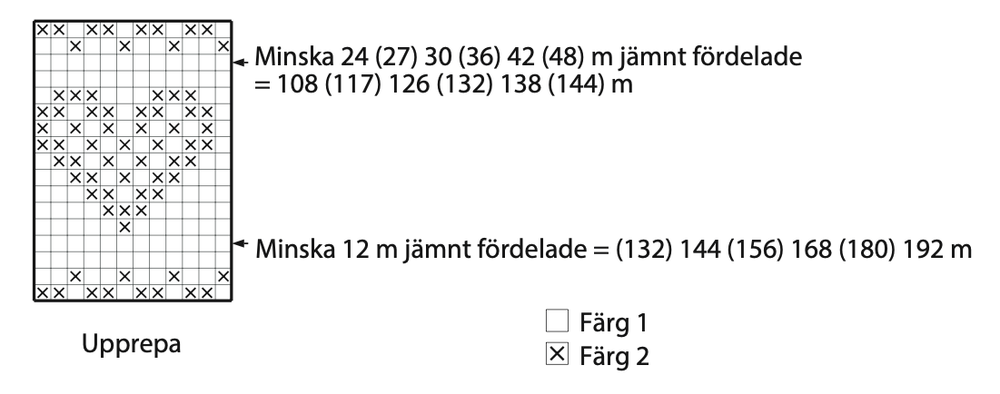 Sticka mönster enligt diagrammet och minska som diagrammet visar. Sticka arbetet färdigt med dubbelt garn av färg 1. Sticka 3 (3) 3,5 (4) 4 (4,5) cm slätstickning. Minska 33 (34) 38 (39) 40 (41) m jämnt fördelade på nästa v = 108 (116) 124 (132) 140 (148) m. Sticka 1 cm slätstickning och minska 38 (42) 46 (50) 54 (58) m jämnt fördelade på nästa v = 70 (74) 78 (82) 86 (90) m. Sticka 1 (1) 2 (2,5) 2,5 (2,5) cm slätstickning.