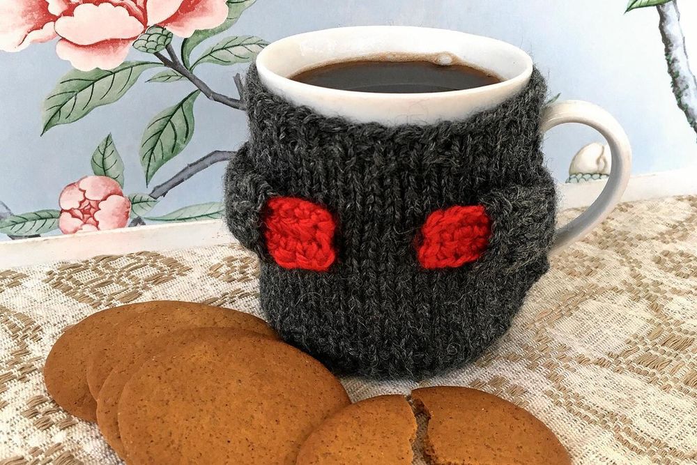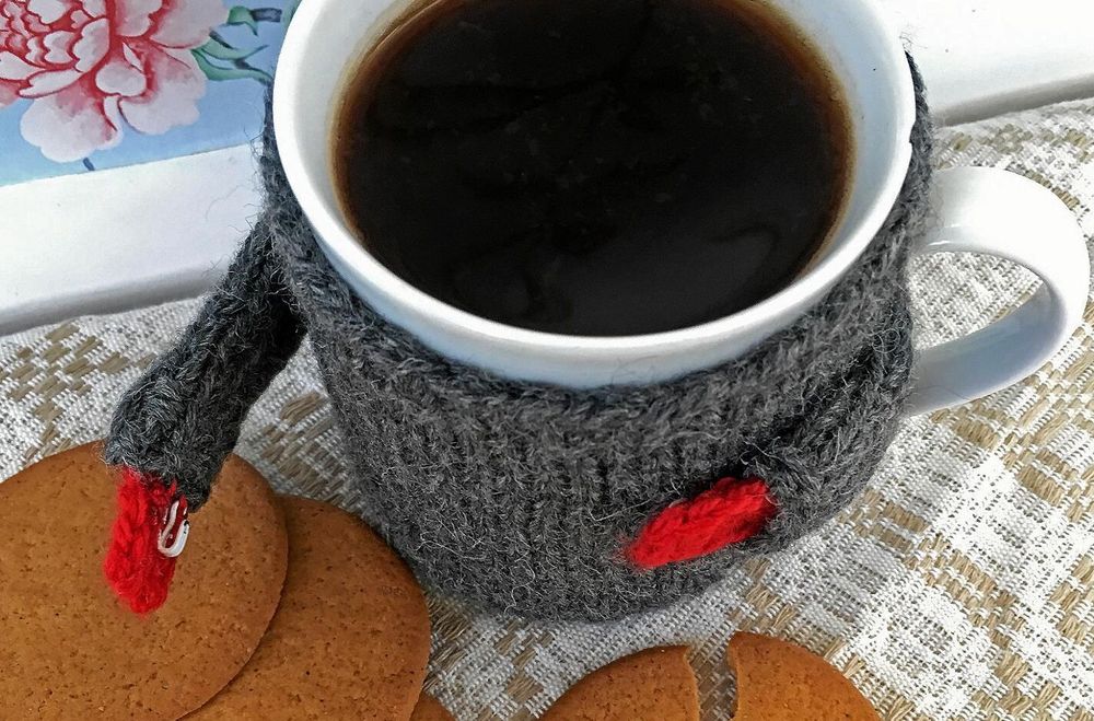 Det spelar ingen roll hur underligt tryck det är på kaffemuggen. Med en snabbstickad tröja syns inte trycket och koppen blir fin, varm och mysig att hålla i.