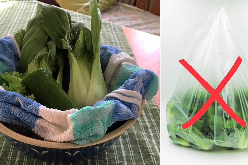 Salladsblad, gurka och andra grönsaker som oftast förvaras i plastpåse i kylskåpet kan i stället hållas fräscha i en fuktig påse sydd av en gammal handduk i frotté.