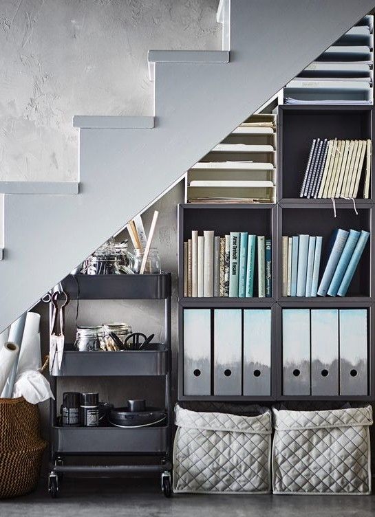 Utnyttja utrymmet under trappan till effektiv förvaring. Maximera med korgar, papperssamlare och smarta möbler på hjul. Källa