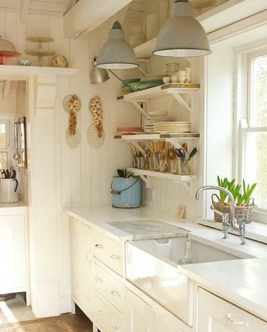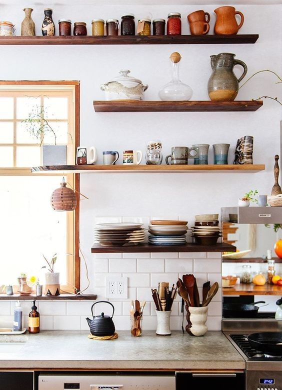 Öppna hyllor i köket ger ett luftigt och ljust intryck. Snyggt och smart om man kan bygga runt ett fönsrtet. Källa