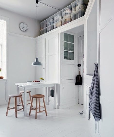 Fiffigt hyllsystem med skenor på väggen strax under taket. Här fästs hyllplan som blir som ett extra innertak med plats för lådor och kartonger. Källa