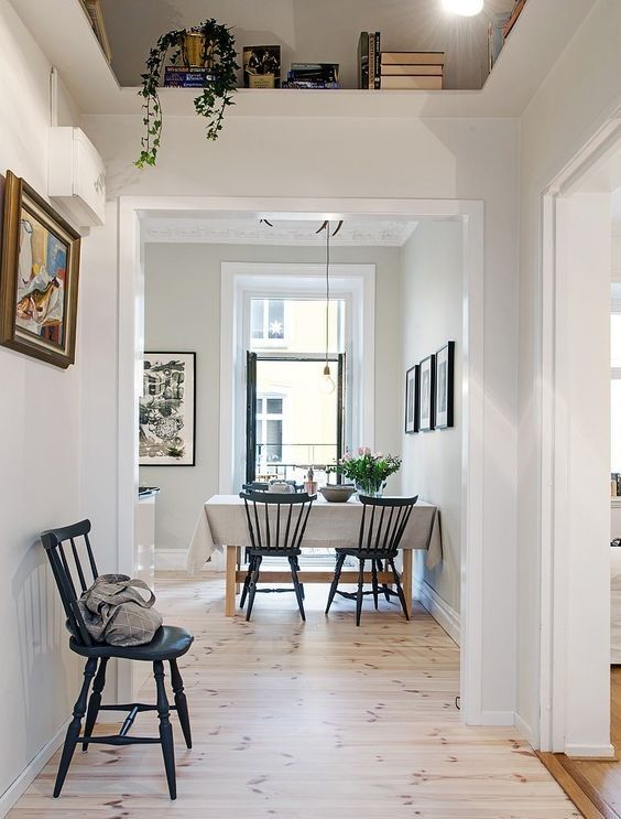 En hylla över dörren med vackra konsoler blir en fin detalj i inredningen. Här kompletterat med öppna hyllor på köksväggen. Den översta sträcker sig över fönstret. Källa