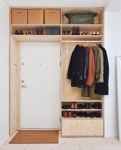 Playwood-bygge för liten hall. Smart allt i ett-lösning med förvaring på höjden. Källa