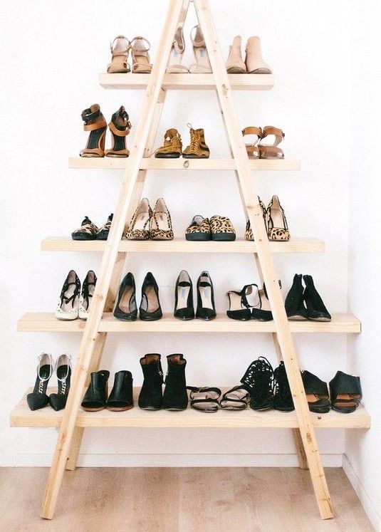 Stapla skorna på höjden så blir de en kul inredningsdetalj i pyramidform. Källa