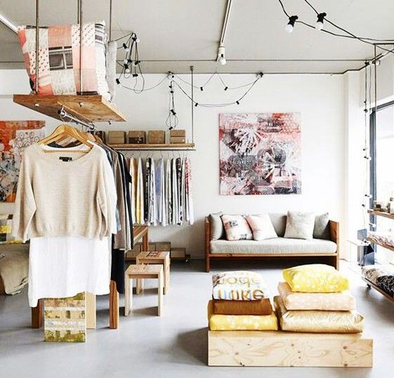 Kolla i klädbutiker efter smarta lösningar. Här en stegmodell med flexibla hyllplan och stänger. Källa