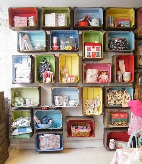 Här är har gamla äppellådor målats invändigt och blivit till fin förvaring i barnrummet. Källa
