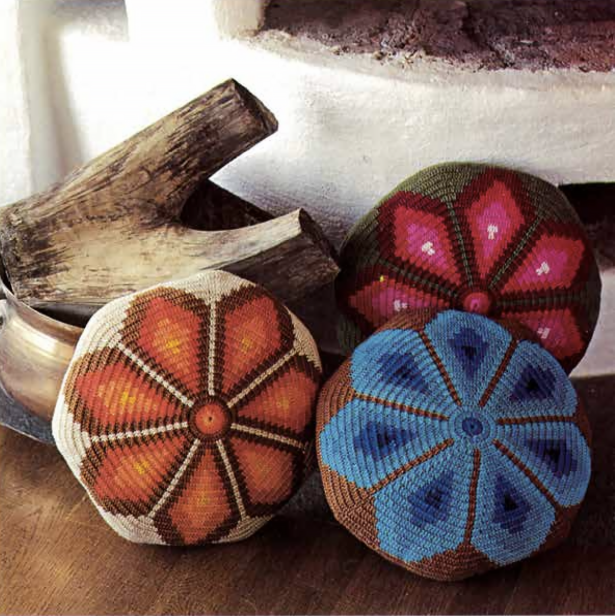 Här är beskrivningen på riktigt fräsiga kuddar i 1970-talsfärger.