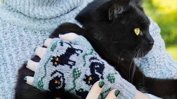 Fint sockgarn på tunna stickor förvandlas till muddar med busiga kissemissar runt om. Given julklapp till kattvännen!