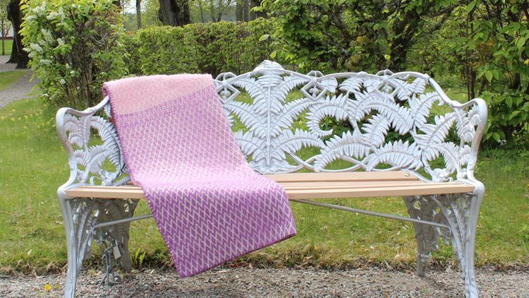 Sex skaft, dubbelt ullgarn och tre färger. Filten Amanda blir en mysig favorit väv i vacker rosengång.