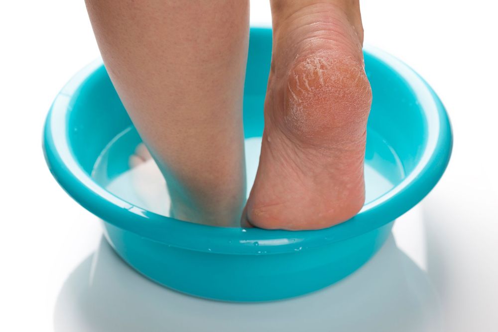 1. Fotbad. För ner fötterna i ett varmt fotbad och mjuka upp fötterna. Droppa i lite tvål eller fotsalt som tvättar och mjukar upp. Sitt i cirka 10 minuter.