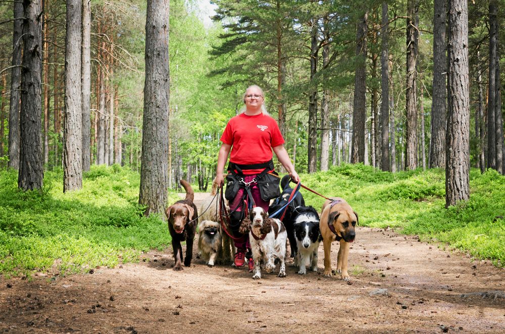 Två gånger om dagen rastar hon ett gäng glada hundar i skogen och det hjälper henne att hantera värken.
