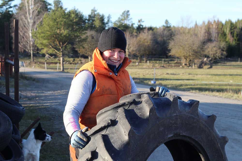 Ida har lagt till träningsredskap från gårdsmiljön. Under en bonnaträning kan hennes adepter få göra olika varianter av benböj, armhävningar och sit-ups på traktordäck – eller rent av dips längst fram på själva traktorn.
