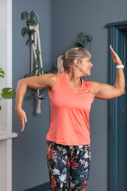 Sänka axlarna och spänn magen när du jobbar med armarna.