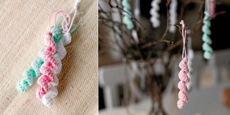 Virkade hängen är en klassiker. Gör dem glatt gula eller i pastellfärger och häng i påskriset.