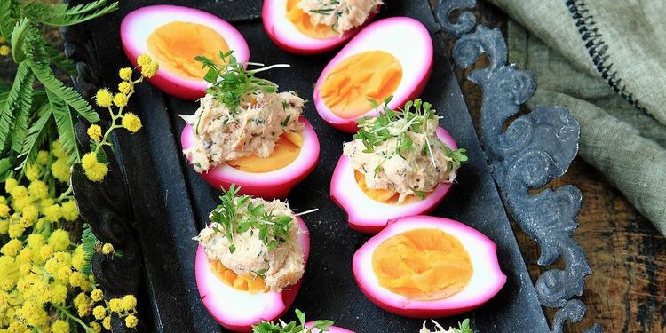 Påskens vackraste ägg picklar du med rödlök och toppar med varmrökt lax och rosépeppar. Supergott!