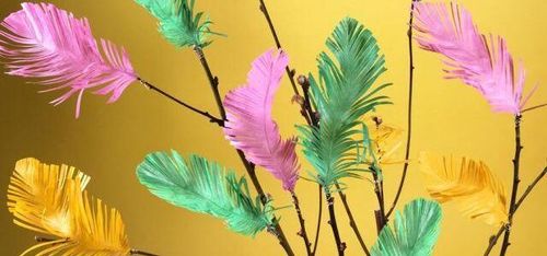 Ett roligt påskpyssel är att göra egna fjädrar till riset. Använd dig gärna av ett tunnare papper som silkespapper eller omslagspapper.