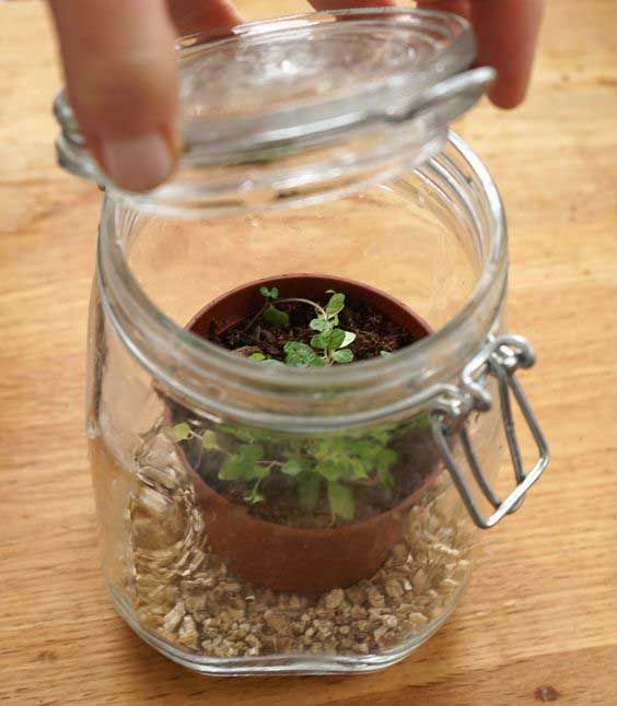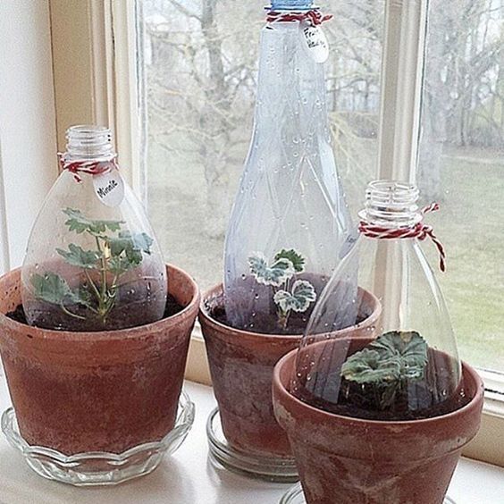 Enklast möjliga växthus. Dela flaskan på mitten, tryck ner delen med öppningen upp och ned i den nedre halvan av flaskan. Häll i vatten och glöm inte att göra ett hål i skruvkorken så att jorden kan dra i sig fukten. Källa