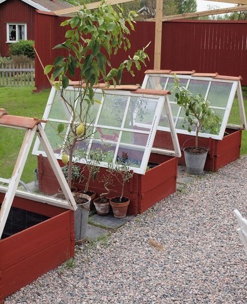 De här söta växthusen gör du med hjälp av gamla fönster, tegelpannor och pallkragar.