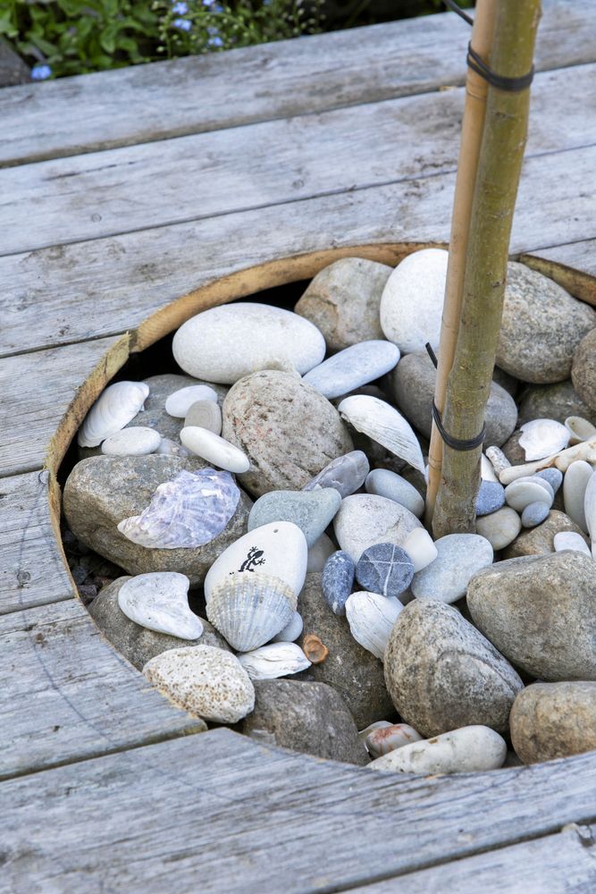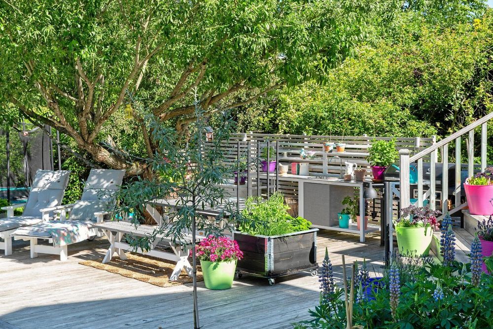 Trappan mellan etagen pryds av kulörta plastkorgar med fyllda kronärtskockor och rödbladig grönkål. Det finns även plats för ren ögonfröjd, som luktärter och kryddtagetes. Dekorationerna och mycket levande material behövs för att så här stora trädäck inte ska kännas ödsliga och livlösa. Bara det nedre däcket är på femtio kvadratmeter.
