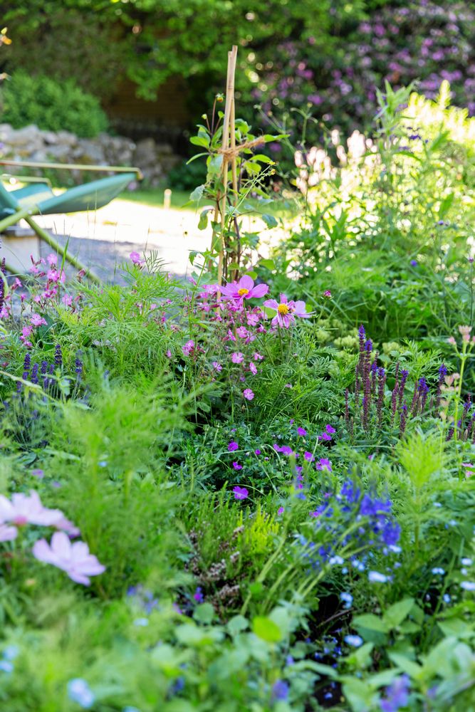 Nedanför dem brer trädgården ut sig med bärbuskar, ett stort perennland och ytterligare ett trädäck för matlagning, samvaro och plats att pyssla och leka. På andra sidan ängen börjar den nordhalländska naturen, som fick familjen att flytta hit för tio år sedan.