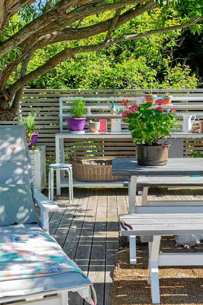 På trädäcket äter familjen frukost, lunch och middag varje dag men det finns också plats för många när det är kalas. Både till vardags och fest dukar Leonor gärna med udda porslin, reseminnen i form av fat och kannor från Samos, Sicilien och andra medelhavsöar blandat med färgglada melaminmuggar.
